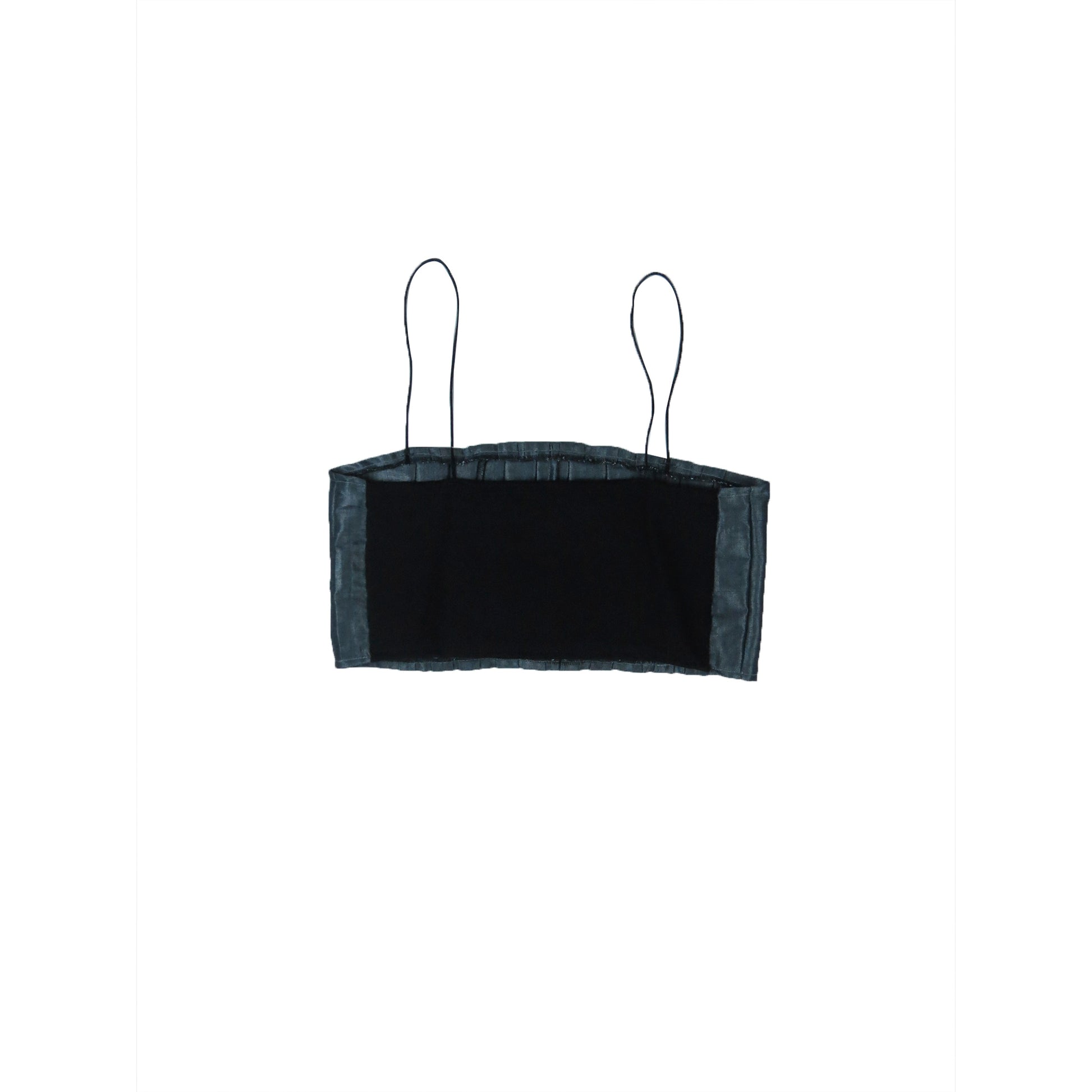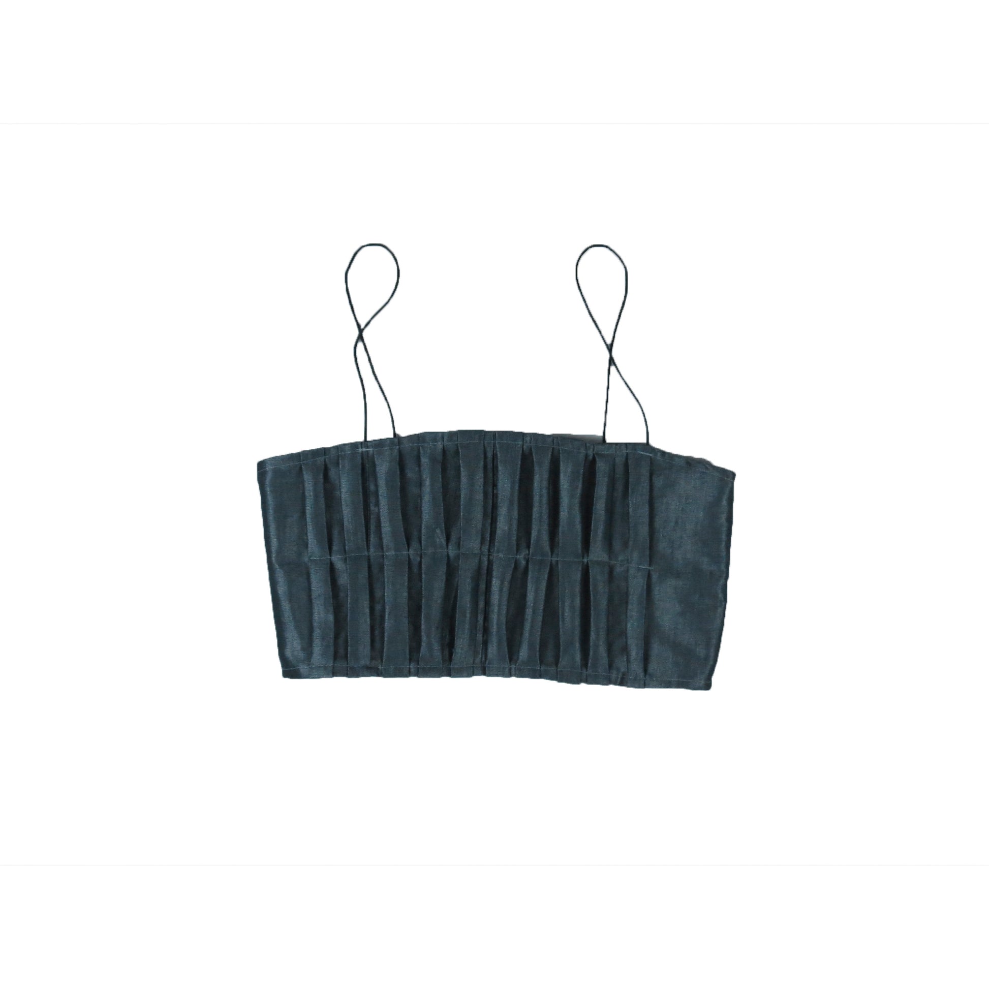 Gray and black pleated textured top with thin straps. Elasticized back panel. This garment is made from repurposed textiles.
