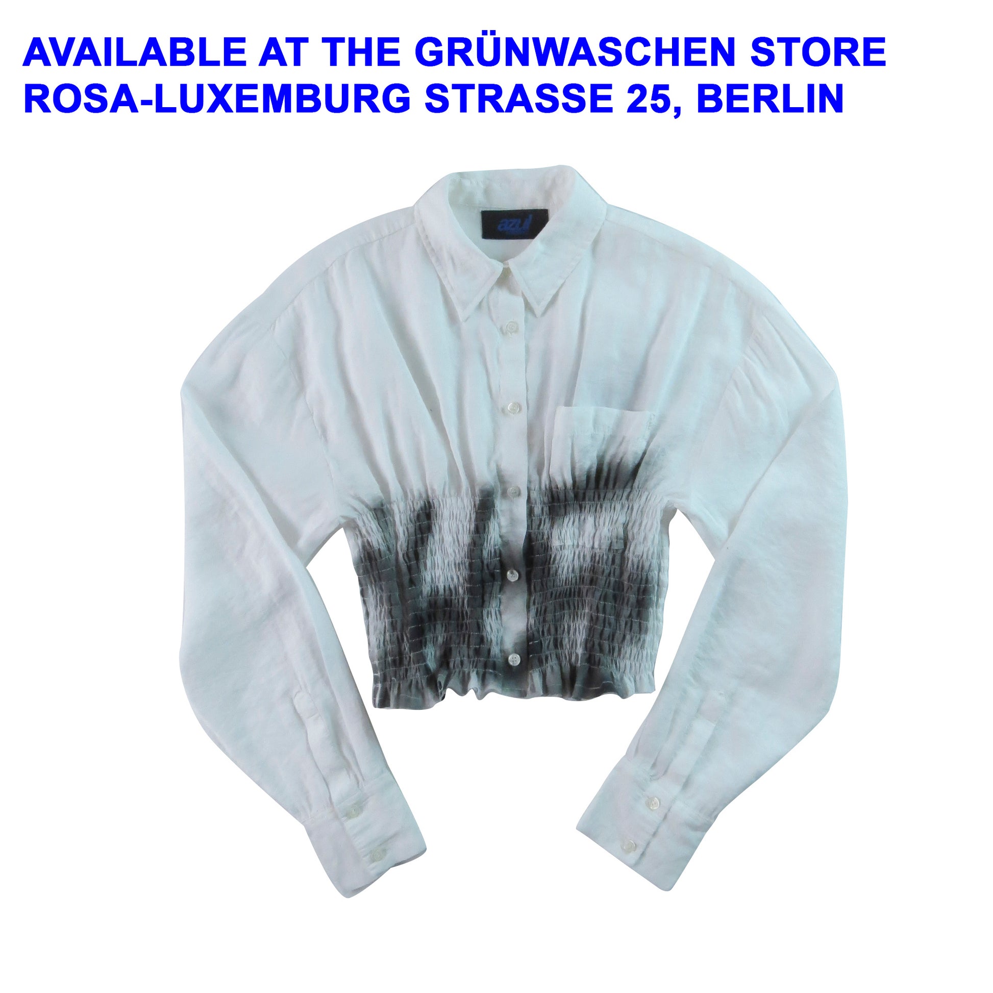 Gray and white striped waist shirt with an elastic honeycomb textile intervention and spray paint. Front closure system with small metal hooks.